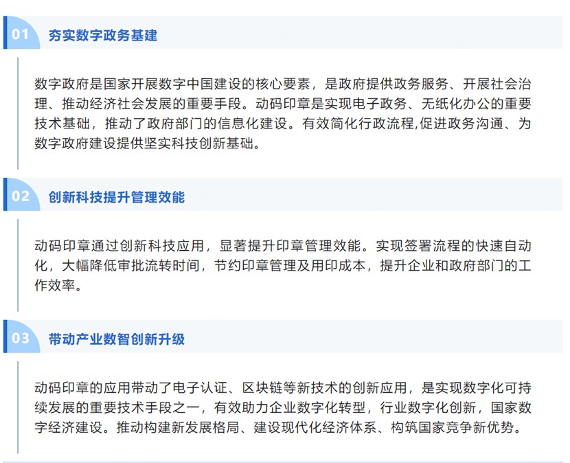 數字化與智能化融合發展的數智化時代已然到來,也將重塑產業生態,形成新質生產力,推動經濟高質量發展。隨著黨的二十大以來,我國全力推進社會主義現代化強國建設,社會經濟活動日益活躍,法治政府、誠信政府的建設步伐也在加快。加快構建高水平社會主義市場經濟體制,極大促進了生產力發展,為中國經濟高質量發展注入充沛動能。在這樣的背景下,建立完善的電子印章管理使用體系,使印章更好地為法治經濟建設保駕護航,顯得勢在必行。