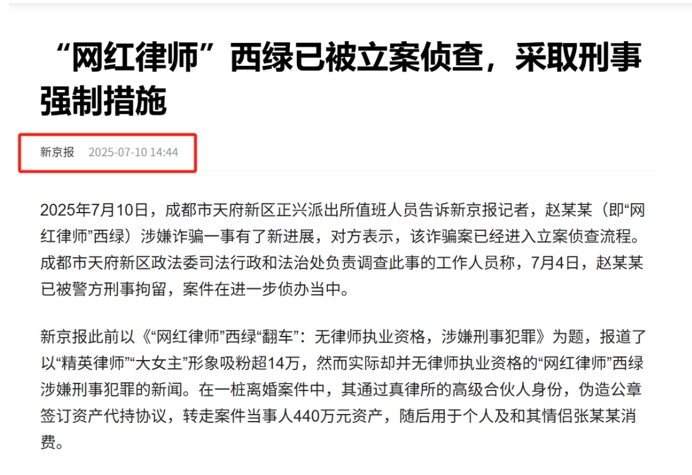 近日,擁有14萬粉絲的成都 “網紅律師”西綠趙某假身份一事,引發廣泛關注。消息稱,這名打造“精英女律師”人設的網絡紅人,實際上并無律師執業資格。