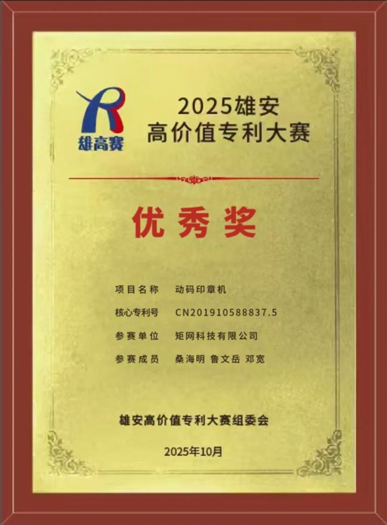 10月22日,推進京津冀知識產權高質量發展暨2025·雄安高價值專利大賽頒獎活動在雄安新區舉行。矩網科技有限公司的創新項目——動碼印章機,在京津冀三地182個優質參賽項目中脫穎而出,榮獲大賽優秀獎。