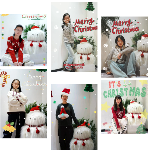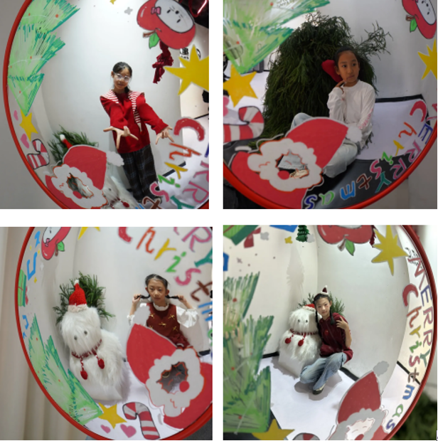 圣誕主題的哈哈鏡成了現(xiàn)場的“快樂焦點”,鏡面上手繪的圣誕襪、圣誕樹、Merry Christmas字樣,與變形后的童趣畫面相映成趣。孩子們湊到鏡前,看著鏡中或高或矮、或胖或瘦的自己,忍不住哈哈大笑,有的對著鏡子比出可愛的剪刀手,有的模仿起模特課堂上學(xué)到的專業(yè)pose,鏡頭抓拍下的每一個搞怪表情,都成了圣誕最鮮活的紀(jì)念。