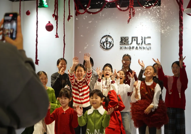 活動的最后,所有孩子齊聚在印有星凡匯logo的背景墻前,穿著圣誕色系的服裝,有的比出勝利的手勢,有的高高舉起雙手,還有的摟著身邊的小伙伴,在歡聲笑語中留下了溫馨的集體大合照。這張合照不僅記錄了孩子們的快樂瞬間,更凝聚了本次圣誕美育活動的美好回憶。