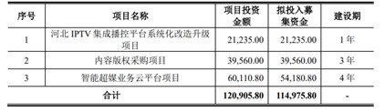 無線傳媒擬募集資金11.50億元用于河北 IPTV 集成播控平臺系統化改造升級項目、內容版權采購項目、智能超媒業務云平臺項目。