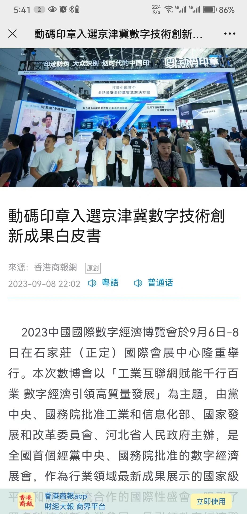“2023中國國際數字經濟博覽會創新成果前100強名單”及《2023京津冀數字技術創新成果》白皮書。矩網科技有限公司自主研發的“動碼印章”成功入圍百強名單和白皮書。