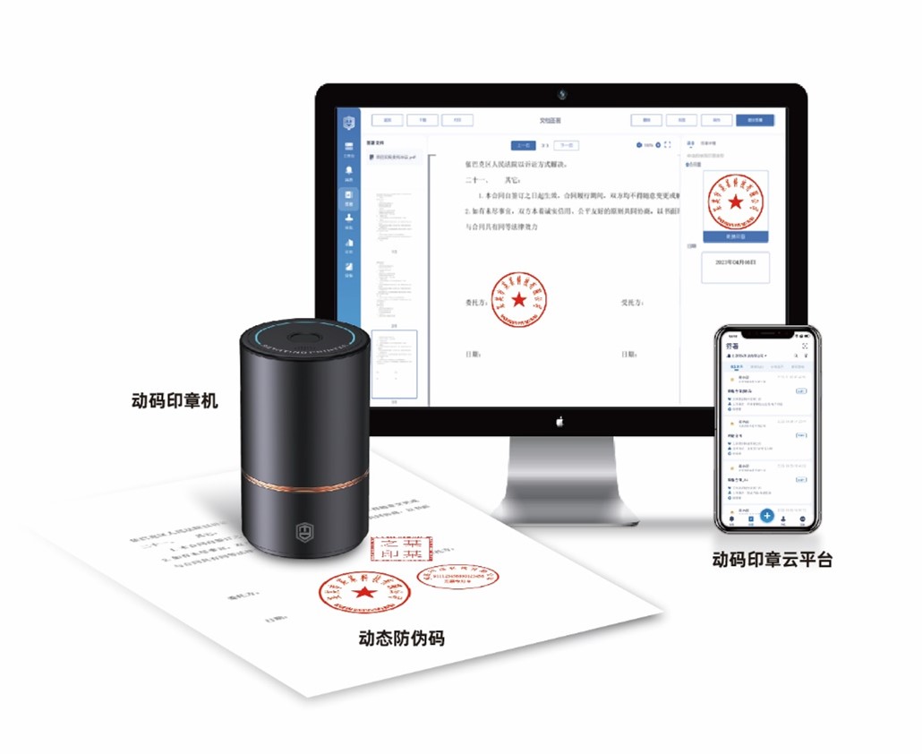 動碼印章主要包括動碼印章機、動態防偽碼、動碼印章云平臺等核心產品,圍繞印章管理、印跡防偽、文件簽署、認證服務、存儲服務、查驗溯源服務形成全方位的管理系統。其“物電同源”、“一機多章”、“印章防盜”、“大眾識別”、“印跡防偽”、“印跡溯源”、“異地用章”、“跨省通辦”等特點,適用于軍隊、政府機關、外交、企事業單位、教育、銀行、醫院及社會各類組織、個人等各種應用場景,有效防范外部假章,管控內部用章風險,助力政企組織實現數字化轉型,提高辦公效率以及印章的精細化管理水平。同時,也能從根源上制止假章、假證、假公文事件,利于打擊違法犯罪活動。